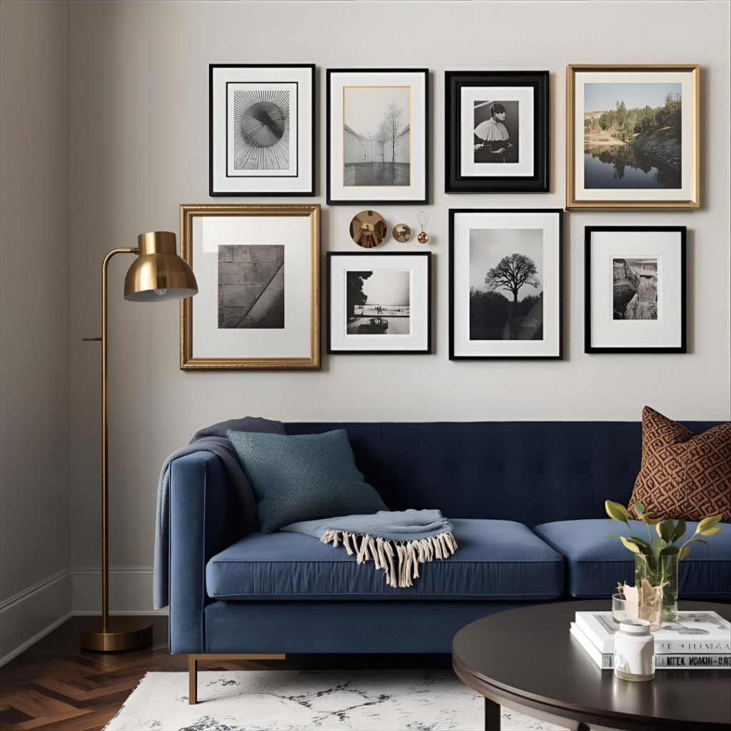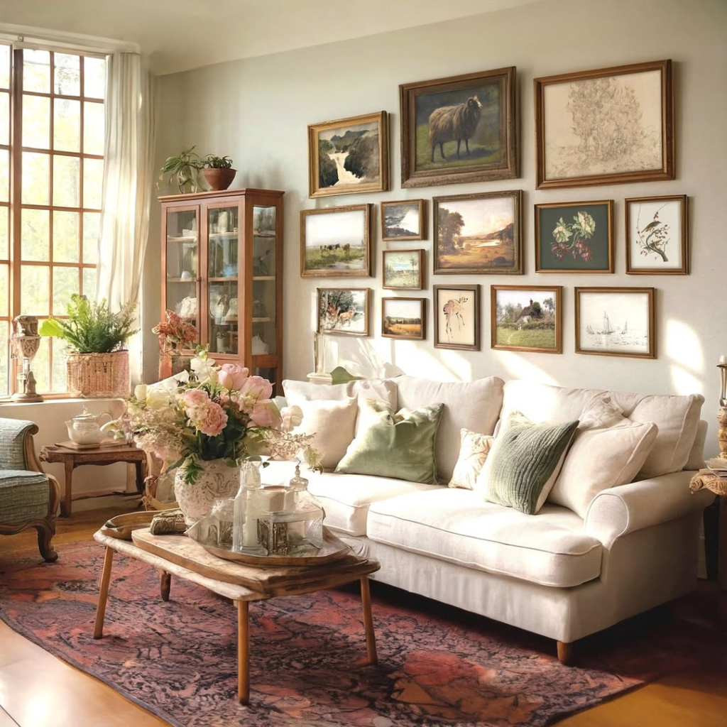 Traditional landscape art never loses its appeal when done thoughtfully. This gallery wall feels personal and storied, as if each piece was collected over time. A mix of frame styles and sizes adds charm while maintaining balance. The living room feels warm, welcoming, and quietly elegant, proving that classic wall art remains a strong design choice.