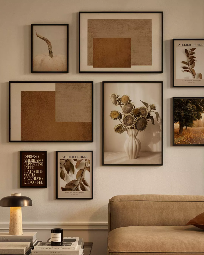 This gallery wall delivers a modern look that feels intentional and cohesive. Each artwork stands confidently on its own, yet together they create a unified visual story. The spacing, color palette, and frame choices keep everything crisp and current. Importantly, the room still feels welcoming rather than sterile. It’s a great example of how contemporary wall art can be stylish and approachable at the same time.