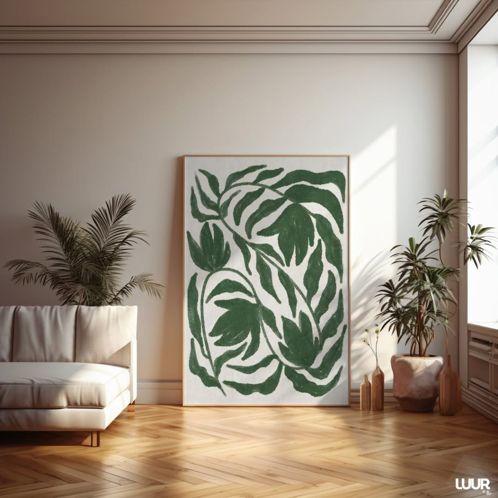 Nature-inspired art brings freshness to this living room without leaning into overly literal plant imagery. The large-scale artwork introduces calm and clarity, offering a subtle connection to the outdoors. It feels sophisticated rather than playful, making it ideal for those who appreciate greenery but prefer a modern, grown-up aesthetic. The result is soothing, elegant, and quietly confident.