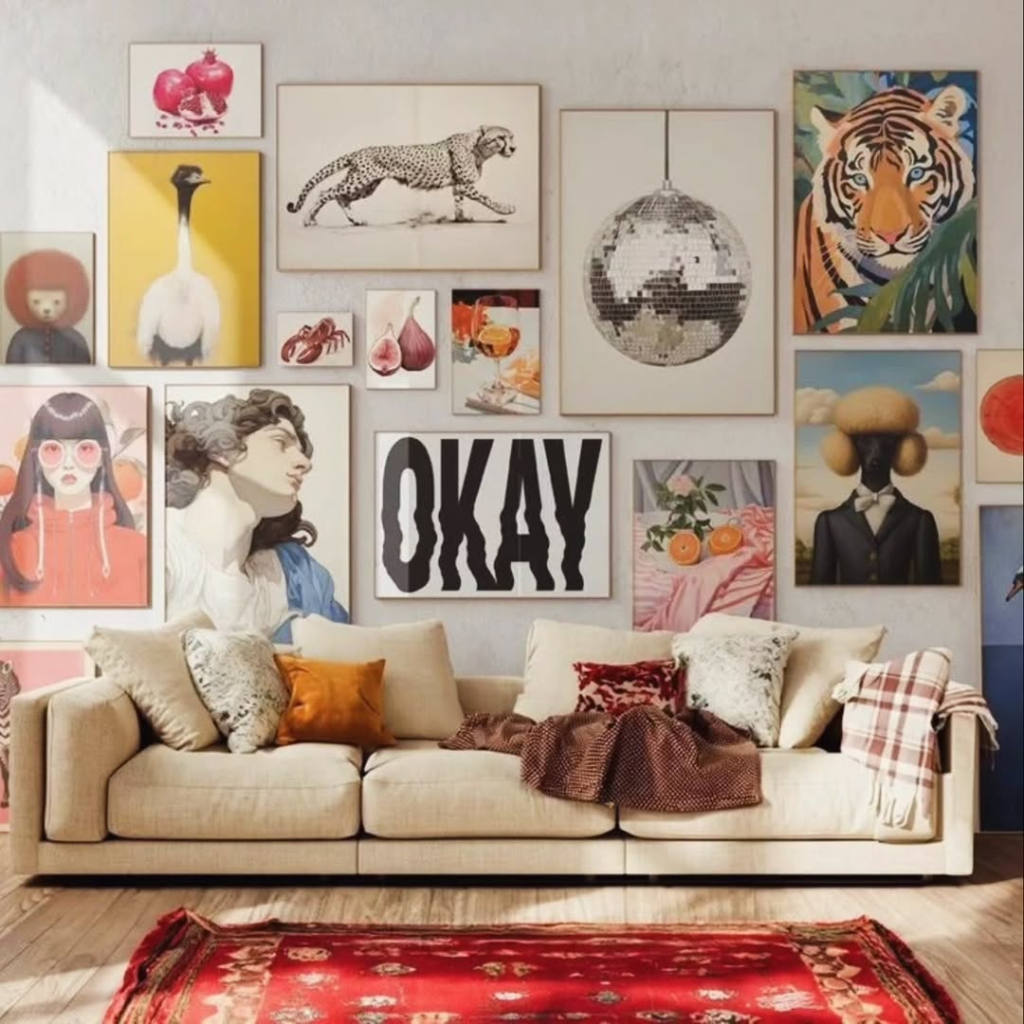 This wall embraces creativity and individuality. A mix of colors, styles, and subjects turns the gallery into a visual story rather than a rigid design formula. Despite its eclectic nature, the arrangement feels cohesive because it reflects genuine personality. It proves that wall art doesn’t need to match perfectly to work—it simply needs to feel authentic and joyful.