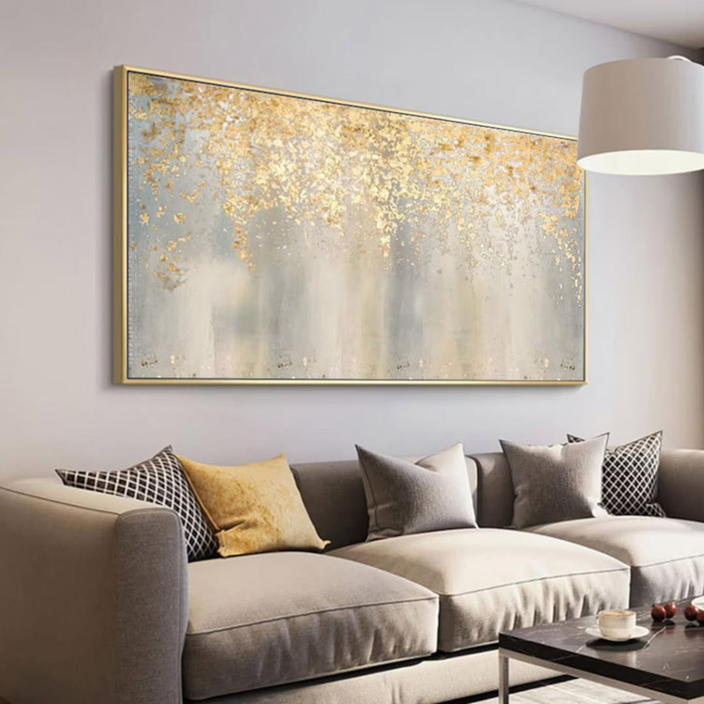 One oversized abstract artwork sets the mood in this living room. Soft neutral tones paired with subtle gold accents add a touch of understated luxury. The piece catches the light gently, enhancing the atmosphere without overwhelming it. By choosing a single, well-scaled artwork, the space feels open and uncluttered while still visually rich and refined.
