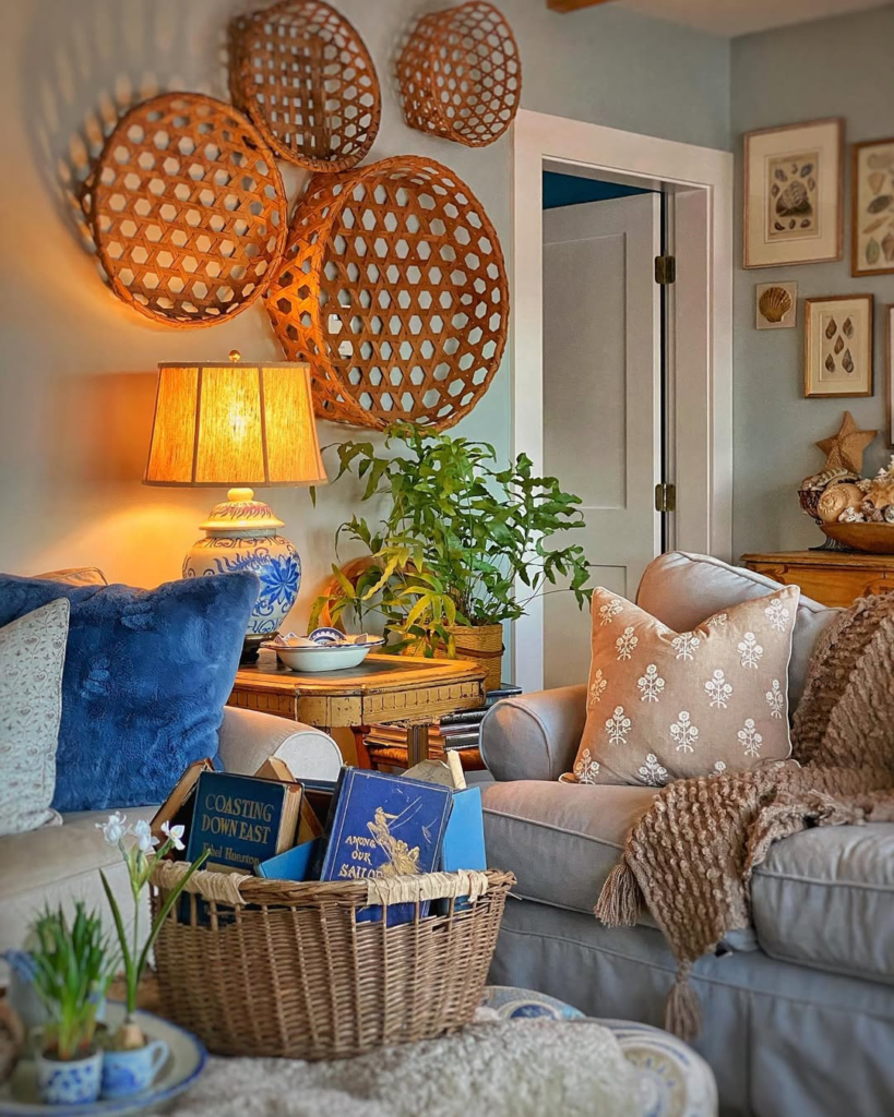 Woven wall baskets bring warmth and texture into this living room, serving as functional art. The arrangement feels layered and natural rather than themed or overly styled. There’s a relaxed coastal influence that makes the space feel inviting and lived-in. It’s the kind of room where comfort and character take priority over perfection.