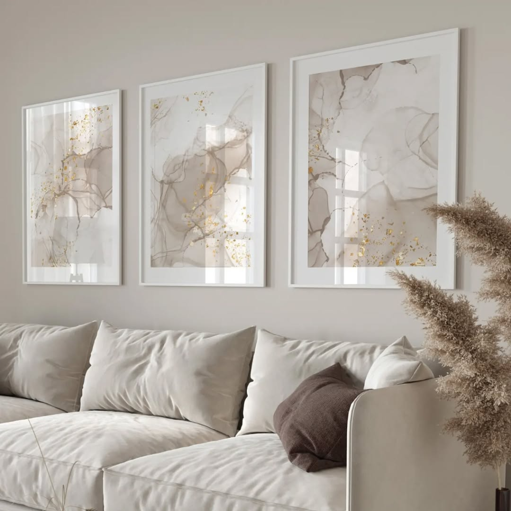 This final setup embodies quiet elegance. Fluid abstract pieces with delicate gold details bring movement and warmth to a neutral living room. The artwork feels light and intentional, enhancing the space without overwhelming it. Everything works together seamlessly, creating an atmosphere of effortless polish and refined comfort.