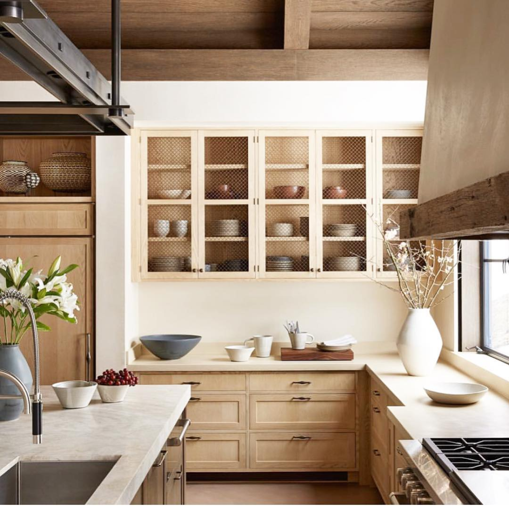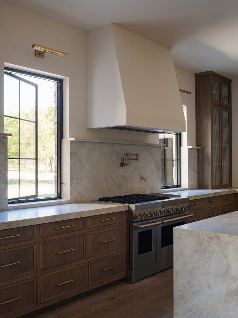 Soft lighting and warm materials come together to create a kitchen that feels luminous and serene. Natural stone surfaces reflect light gently, enhancing the golden tones of the wood cabinetry. Carefully placed fixtures add warmth throughout the day, maintaining a welcoming atmosphere from morning to evening. Symmetry and thoughtful layout contribute to the sense of harmony, making the space feel calm and well-proportioned. This kitchen blends rustic influence with refined finishes, offering understated elegance that feels both comforting and elevated.