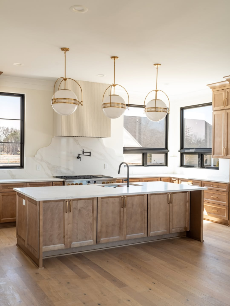 This kitchen demonstrates how thoughtful proportions and contrast can elevate a space. Soft, light cabinetry creates an airy foundation, while natural wood elements add structure and warmth. The layout feels tailored without being overly ornate, offering a sense of customization that remains approachable. Subtle backsplash tones introduce depth while keeping the palette cohesive. Gentle lighting enhances the textures throughout the room, creating a welcoming glow that works from morning through evening. The result is a kitchen that feels both refined and effortlessly livable.