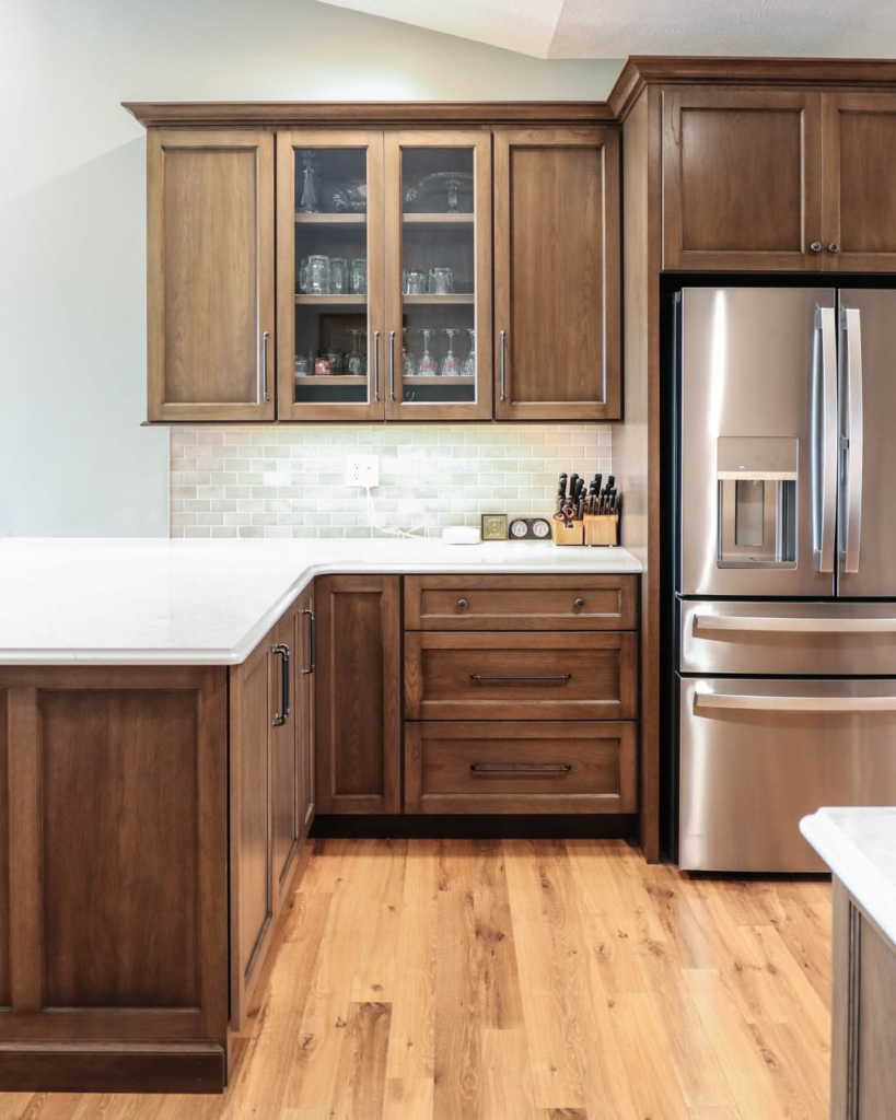 Classic wood cabinetry takes center stage in this kitchen, refreshed with clean lines and subtle detailing. Glass-front upper cabinets add openness and reflect light, preventing the space from feeling heavy. A glossy tile backsplash introduces gentle texture and brightness, enhancing the richness of the wood. The overall design feels timeless rather than trend-driven, offering long-term appeal and everyday comfort. It’s a kitchen that feels familiar yet updated, blending traditional materials with a tailored, modern sensibility.