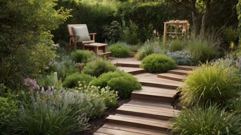 A stepped timber pathway built into a natural slope offers balance between landscape and structure. Raw wood blends with mulch and plantings, while geometric landings punctuate the climb for rhythm and rest.