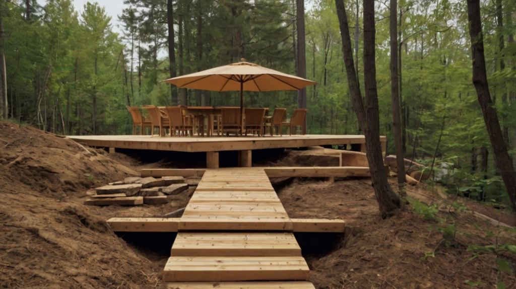 There’s a sense of tension between nature and structure—a preview of architectural precision meeting organic beauty. This “in-progress” stage is inspiring for anyone considering a custom wooden walkway, showing that patience and thoughtful planning produce pathways that are both functional and visually compelling.