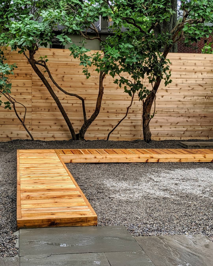 Minimalist enthusiasts will appreciate a raised cedar walkway that floats over gravel, forming an elegant L-shape. Its clean lines contrast beautifully with sculptural trees and a layered wooden fence, combining natural warmth with architectural clarity.
