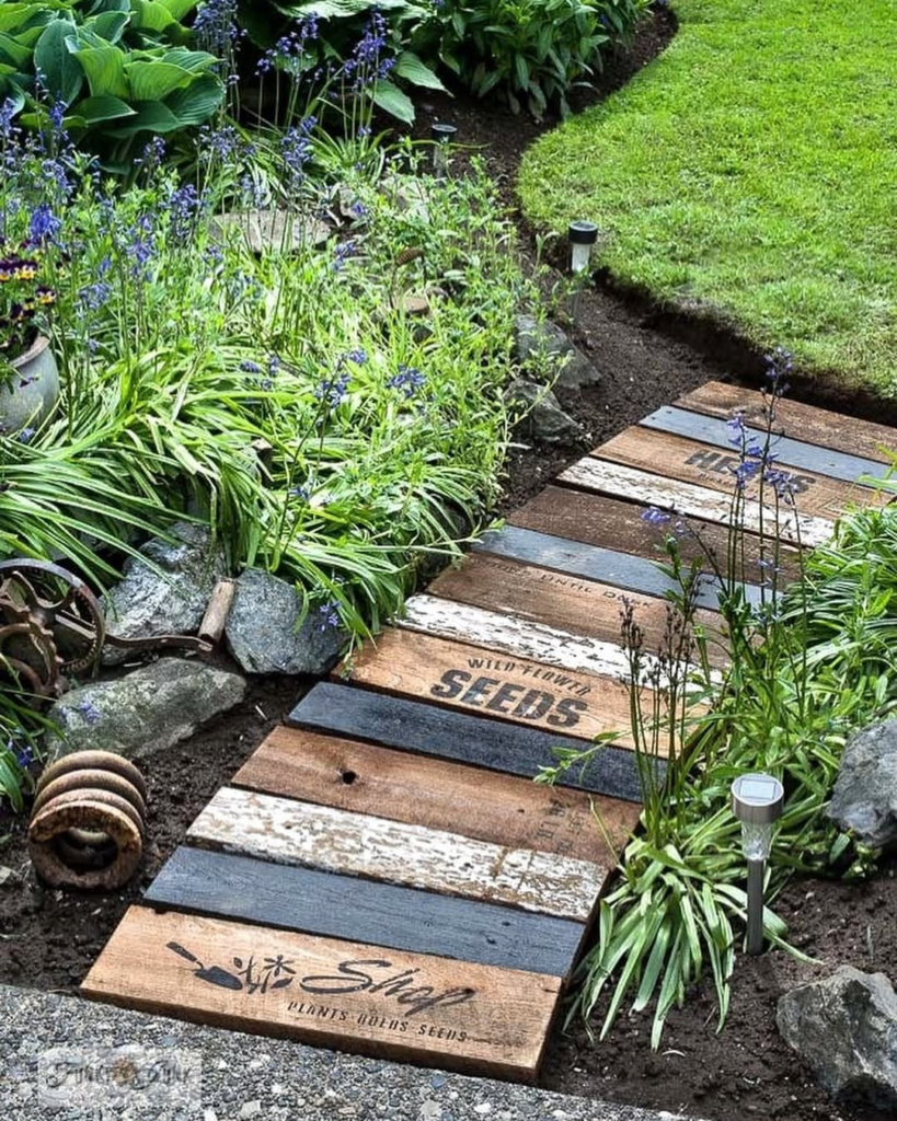 Reclaimed wooden planks can create pathways full of character. Weathered boards with stamped text or subtle imperfections add storytelling to every step, complementing green borders, flowers, and small solar lights.