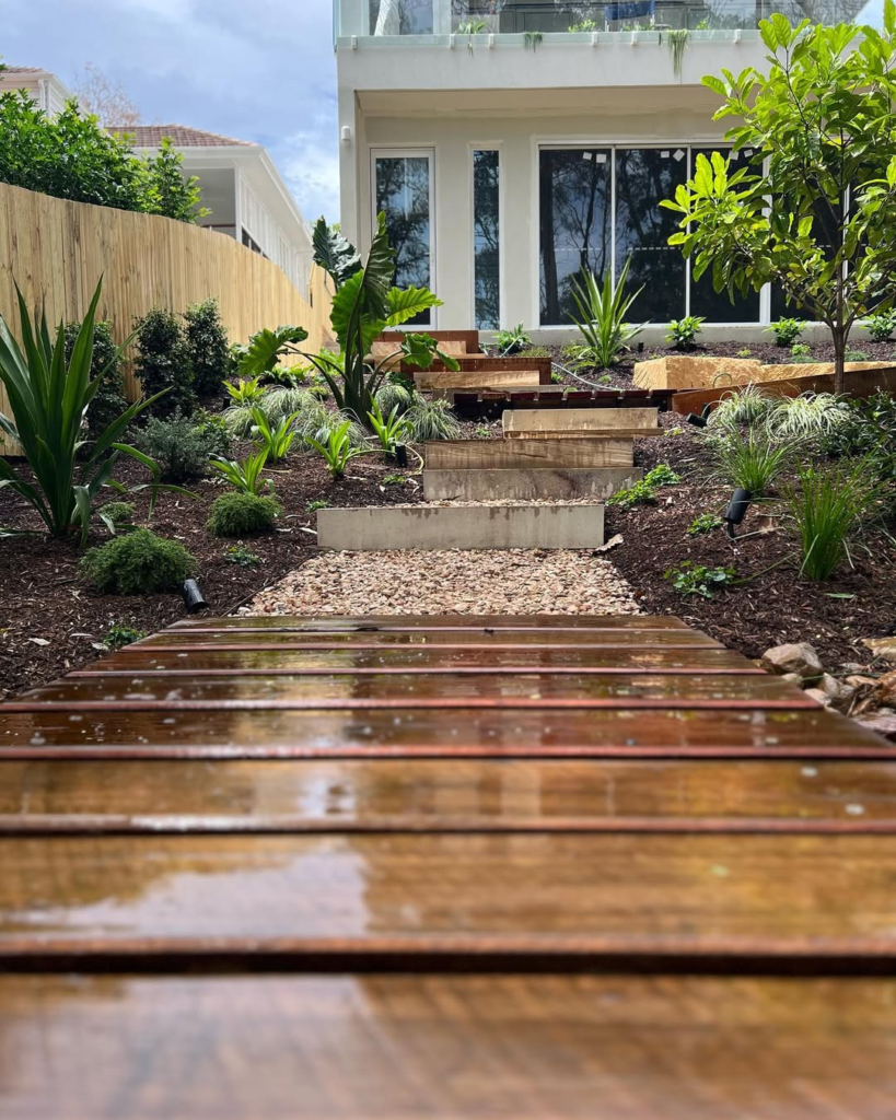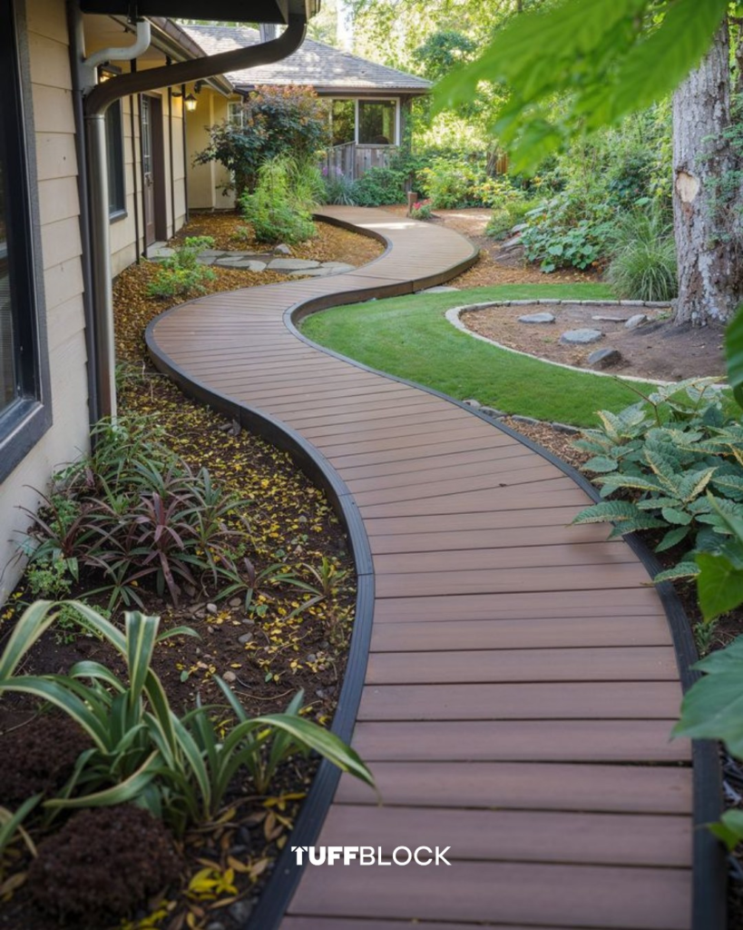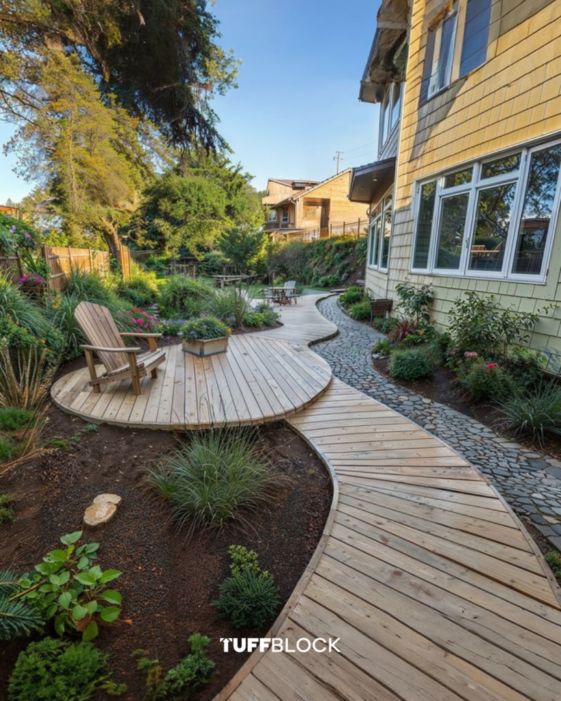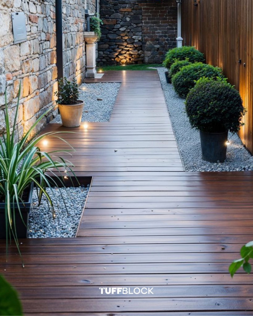 Sometimes, modular design creates the most harmonious outdoor experiences. A wooden walkway paired with white pebbles and lush plants delivers rhythm and structure without overshadowing the surrounding greenery.