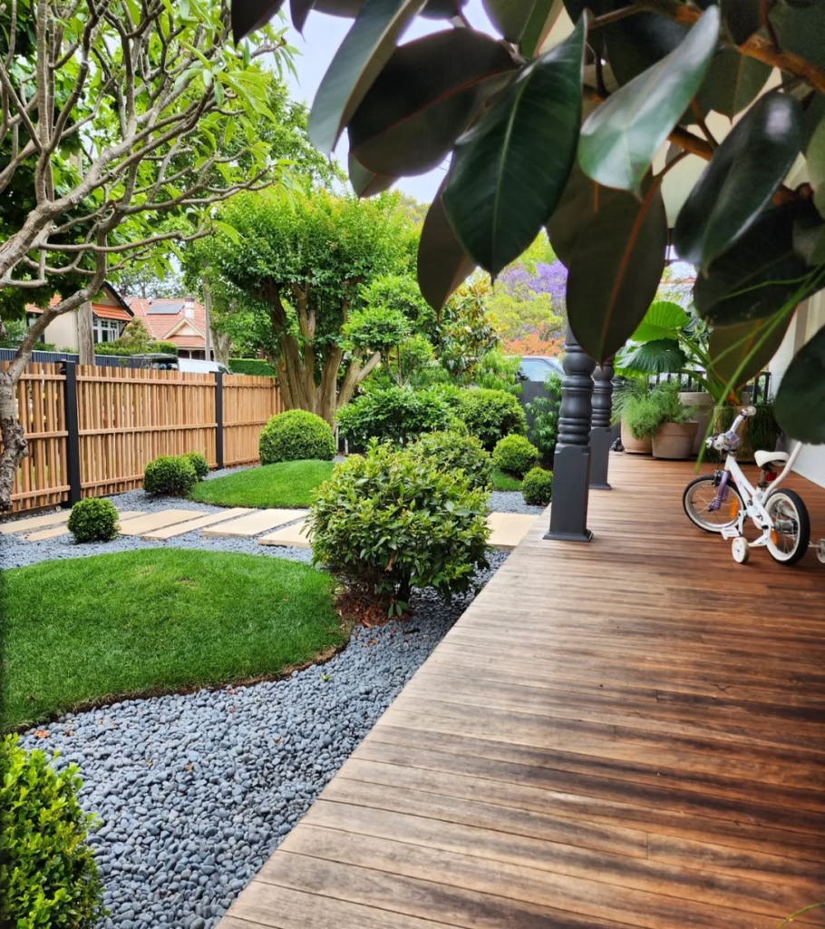 A well-structured backyard path blends manicured hedges, black river rock edging, and smooth timber boards. The juxtaposition of soft greenery with clean wooden decking allows barefoot wandering and casual strolling.
