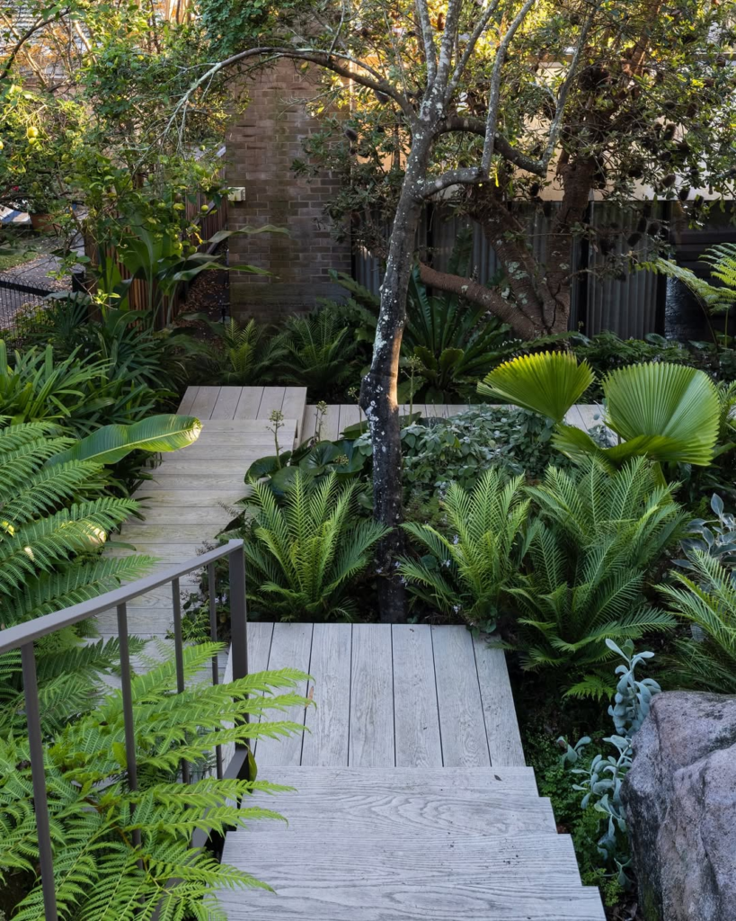 A forest-inspired pathway winds through dense ferns, palms, and trees, offering seclusion and serenity. Timber boards almost disappear beneath the foliage, creating a secret, immersive garden experience.