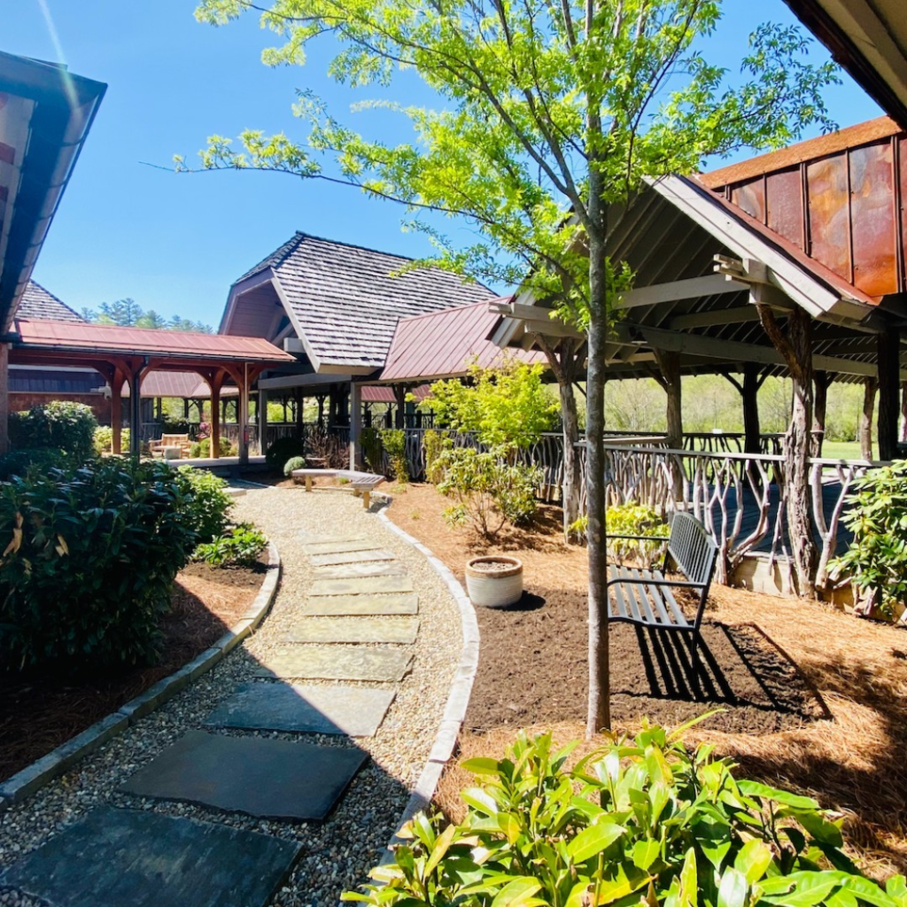 Stone and gravel paths curve gently through landscaped areas, guiding visitors past benches, gazebos, and planting beds. The organic layout encourages conversation and relaxation, making outdoor spaces feel alive yet intentionally curated.