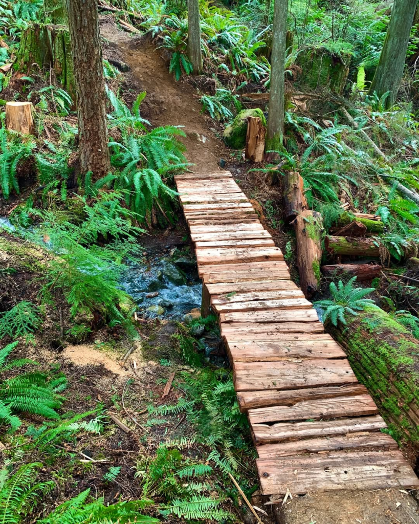 Once completed, the boardwalk takes on a playful zigzag pattern beneath trees, surrounded by ferns and mulch. Each plank feels intentional, following the contours of the woodland floor without imposing artificial rigidity. The scattered greenery adds texture and softness, creating a harmonious dialogue between natural growth and human design.